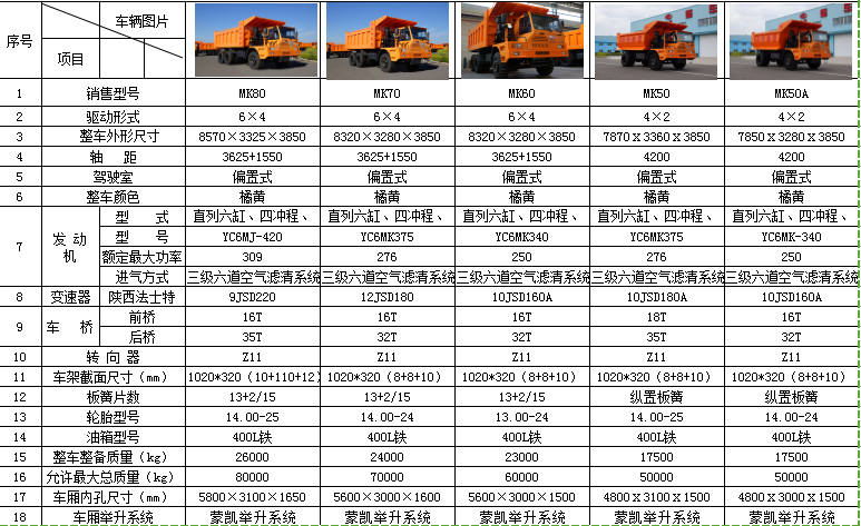 MK50兩軸礦用車以公司MK70平臺打造,國內(nèi)市場首創(chuàng),填補該類礦用車產(chǎn)品市場的空白。采用行業(yè)內(nèi)得到廣泛認可的玉柴發(fā)動機、法士特變速箱、車橋承載系統(tǒng)及舒適豪華的駕駛室??捎糜谝苯鸬V山、露天煤礦與鐵礦、水利水電工地、有色金屬礦山、建筑工地等場所的物料運輸設(shè)備。